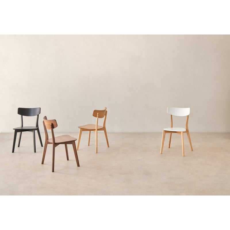 Silla de madera de hevea con asiento en MDF lacado en color roble, y nogal.